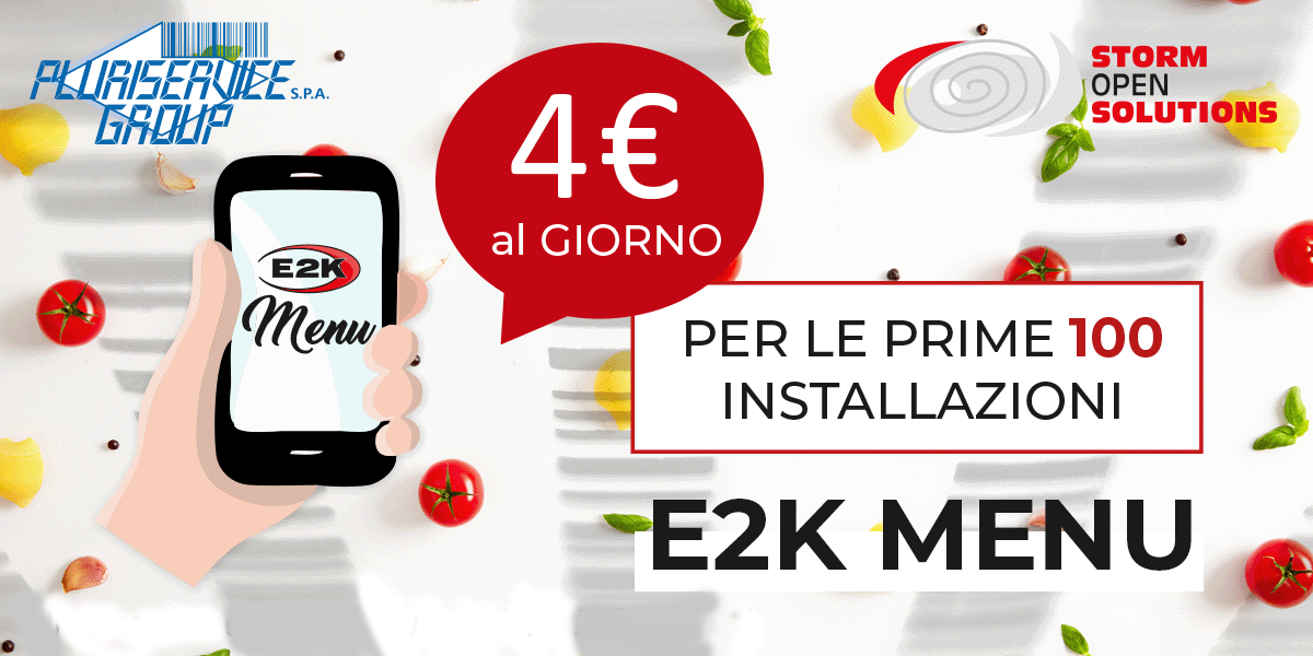E2K Menu è un’app web progettata dalla Storm Open Solutions Srl, azienda del Gruppo Pluriservice, e rivolta alla ristorazione. Nasce con l’obiettivo di facilitare e semplificare le operazioni che stanno dietro ad ogni ristorante, bar, pub, hotel e tutte quelle attività che operano in questo settore.