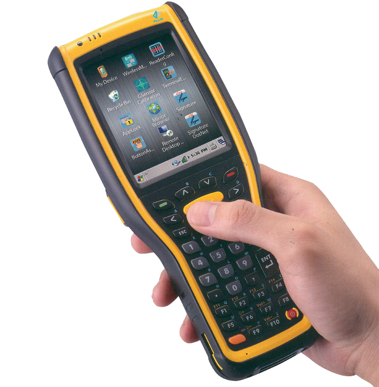 2D, LONG RANGE, RUGGED TERMINAL FOR LOGISTICS AND PRODUCTION. If you need a rugged, performing and shock-resistant terminal, PLUS 9700 2D is perfect for you. With its ip65 protection grade for water and dust, it can be used in difficult environments. It has numerous barcode reading options that best suit various scanning situations (1D Laser / 2D Imager / 1D Extended Range Laser / Near / Far 2D Imager / Mid-Range 2D Imager on request). Its three different keyboard options (30 keys, 38 numeric keys and 53 alphanumeric keys) meet most different user needs. In addition , the 53-key keyboard is available in different versions, according to the terminal emulation type (VT220, TN3270, TN5250). Its standard (3600 mAh ) or enhanced (5400 mAh) battery provide long term use. Compact and ergonomic, it is suitable for prolongued use. A pistol grip is provided for intense barcode scanning, facilitating operator’s use. It operates with Windows Embedded Handheld and is also available with OS Windows CE 6.0 and Android 6.0